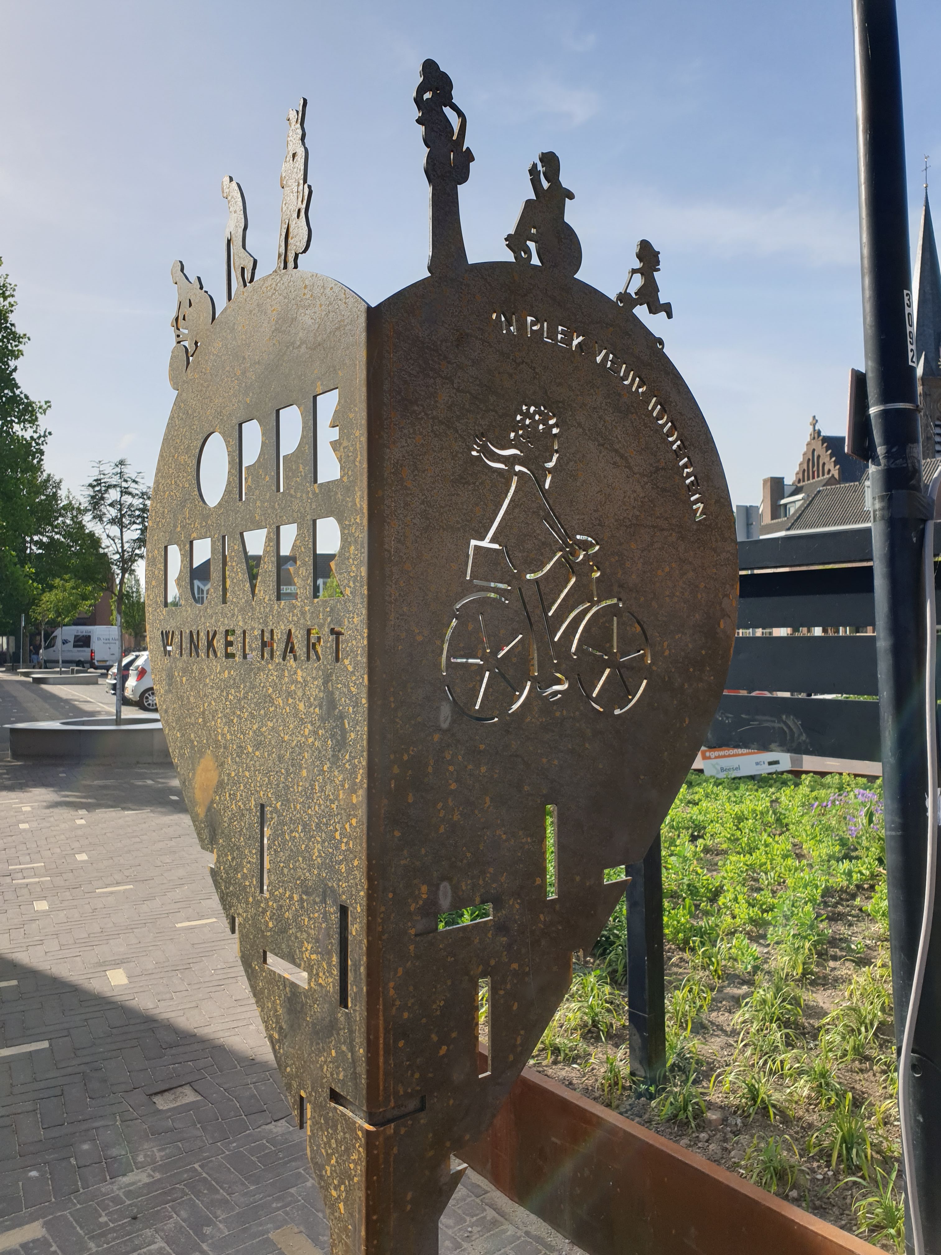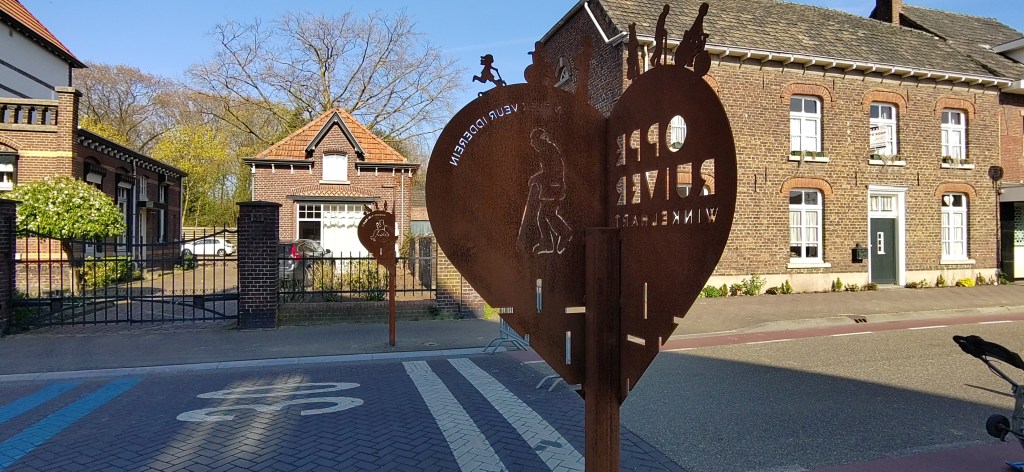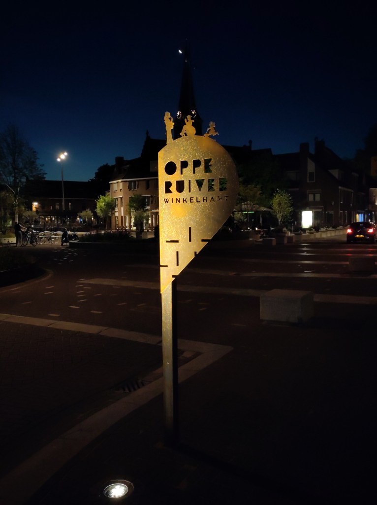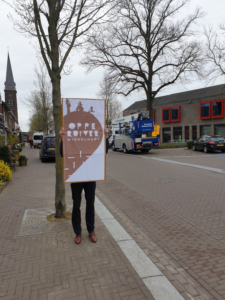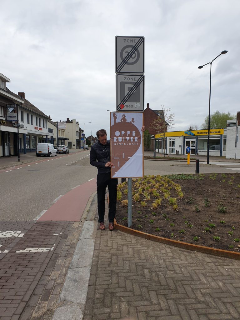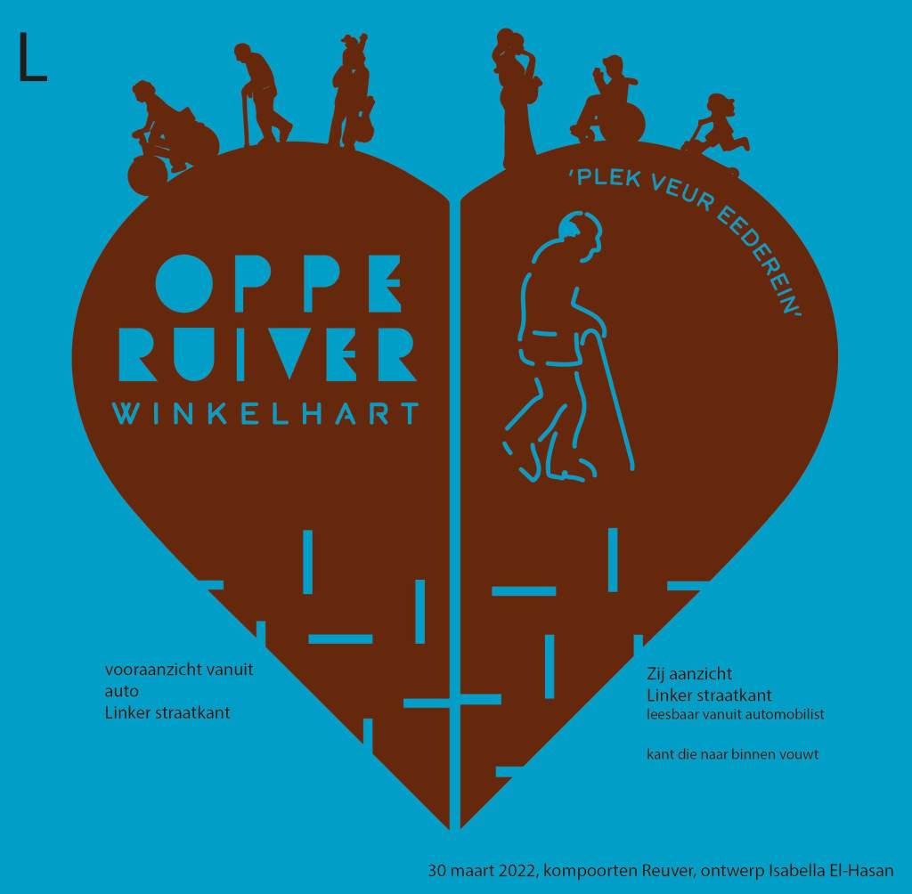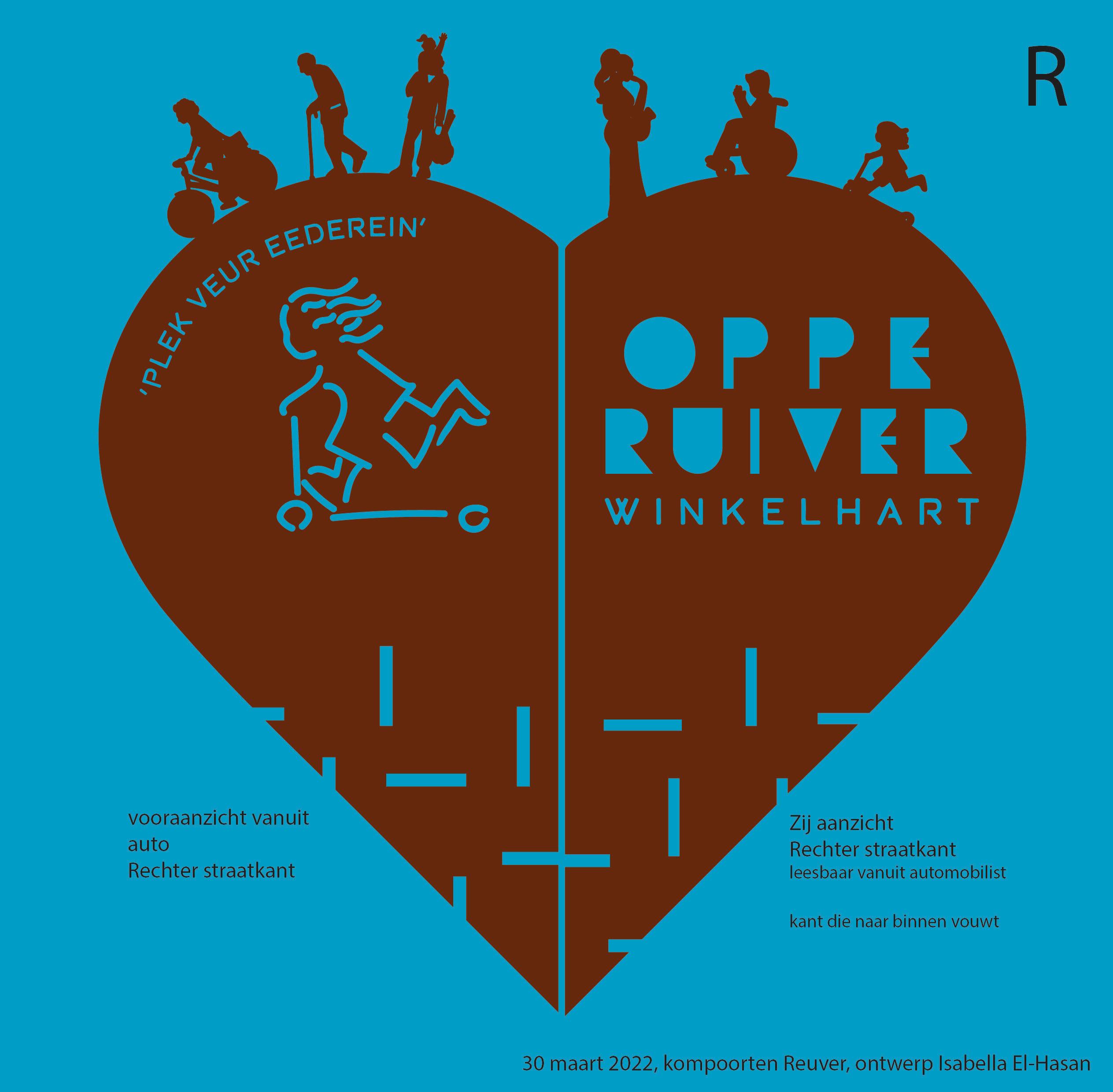 De borden zijn in de vorm van een hart, ze zijn een slag gevouwen waardoor je bij het binnenrijden van het centrum alleen de ene helft ziet met: Oppe Ruiver, winkelhart. Maar als je op de stoep staat kun je de andere helft zien, met een afbeelding en de tekst: ‘n plek veur idderein (Reuvers dialect voor: een plek voor iedereen).